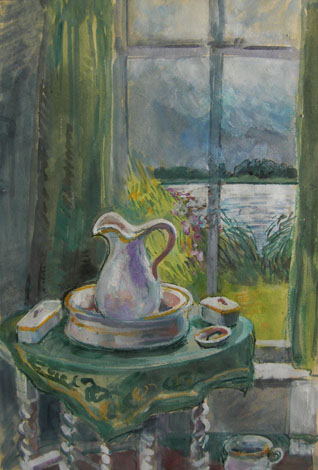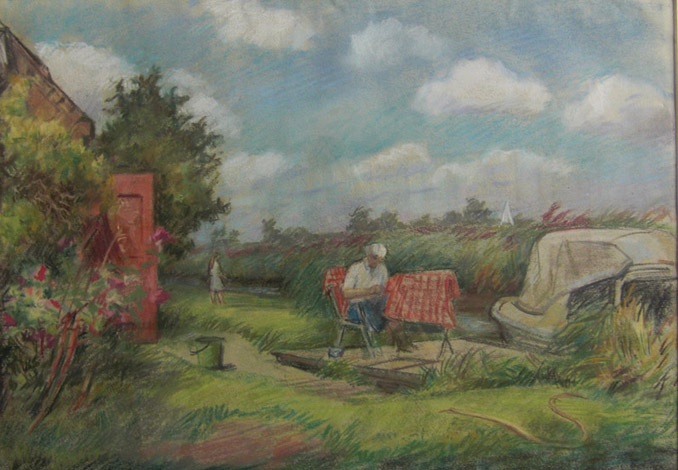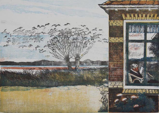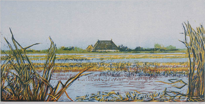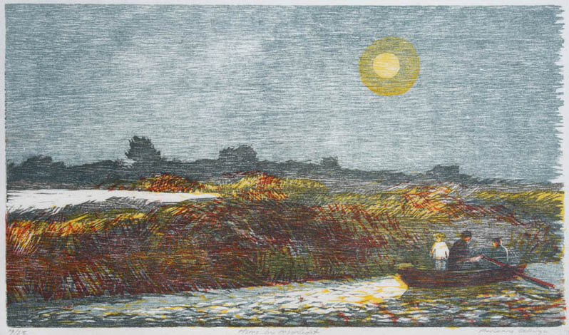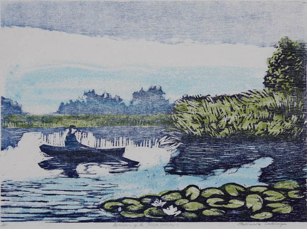 Roeien op de Friese meren, woodcut, 20 x 35 cms, 1992